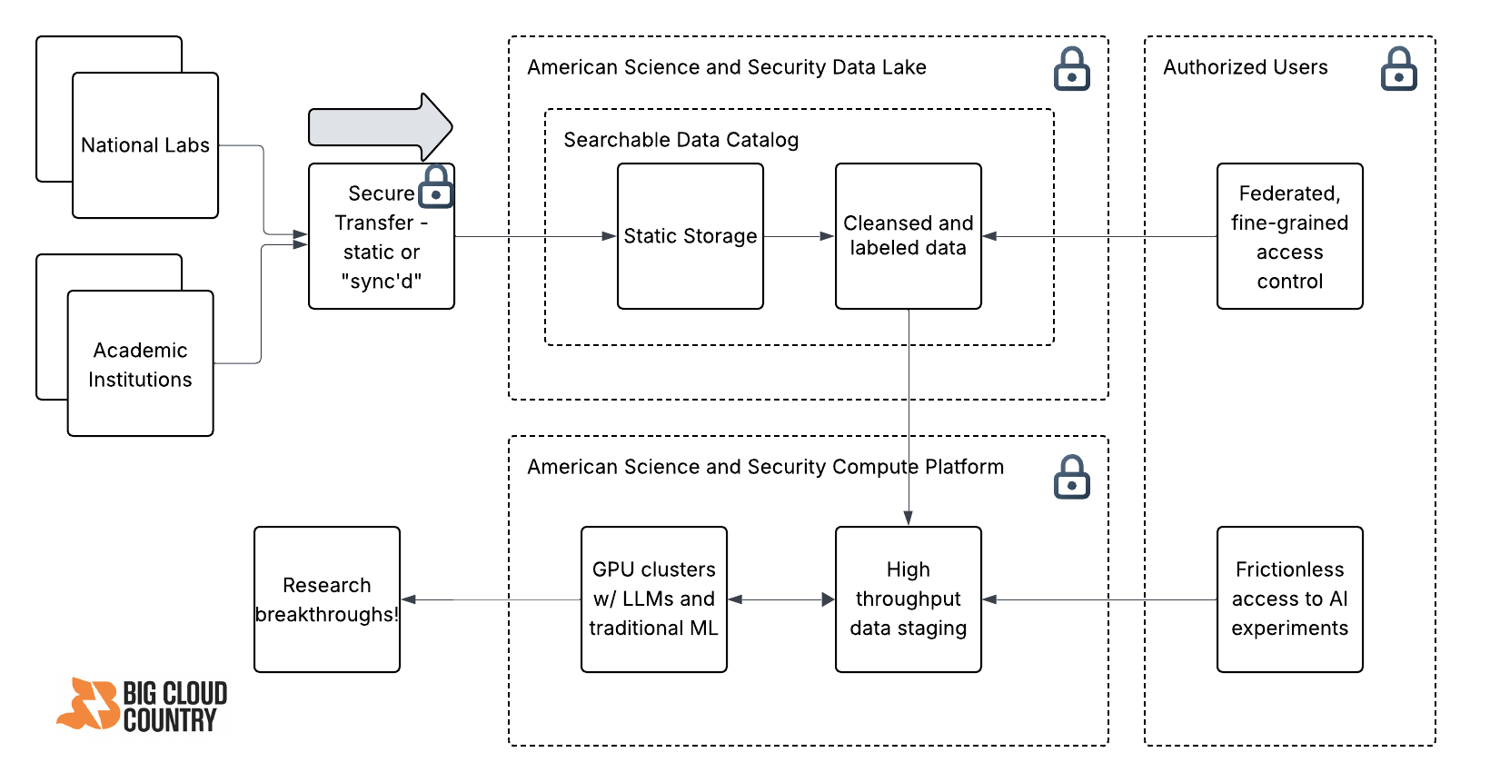 The Genesis Mission is an ambitious project that seems obvious - open up the incredibly valuable work the National Labs have created over decades to other Labs, research institutions, and strategic commercial partners, to allow AI to do its thing on data that is bound to contain rich insights we haven’t unlocked before. But how to build the platform? I believe it’s hiding in plain sight: a classic cloud datalake with state-of-the-art access controls and smart decisions around how to get the data available and exposed to the most powerful AI models in the world.